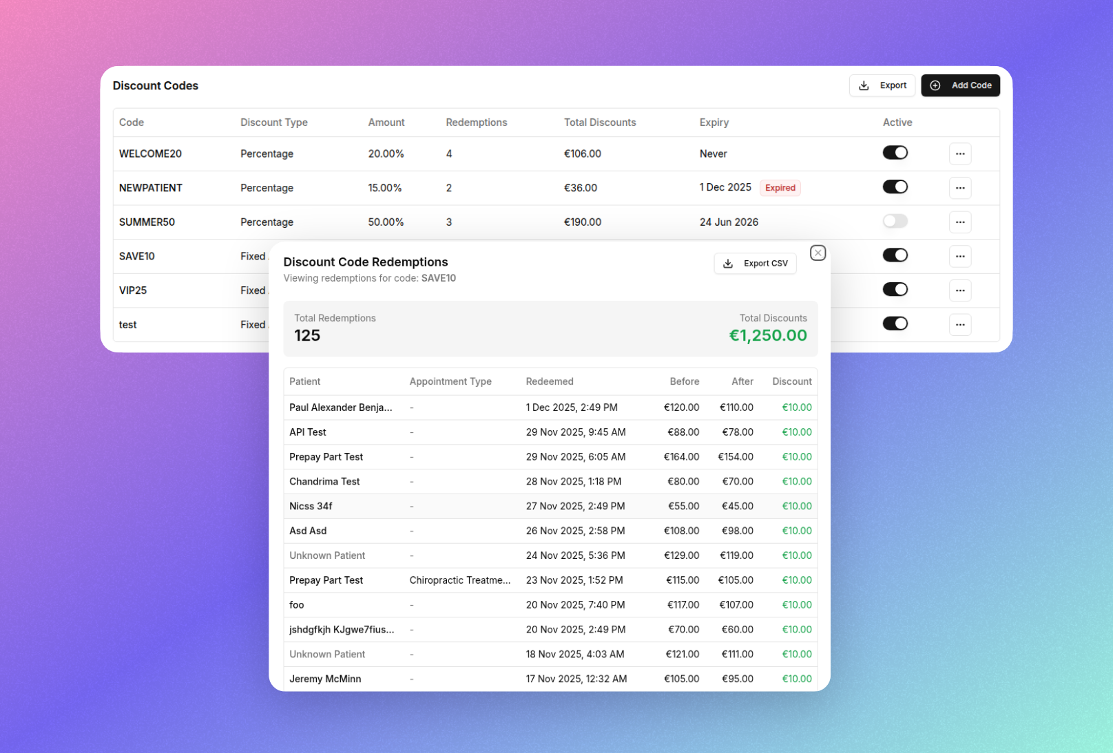 Every redemption is now captured automatically. When a patient applies a discount code during online booking, the system records the patient name, appointment type booked, original amount, discounted amount, and the exact date and time of redemption.