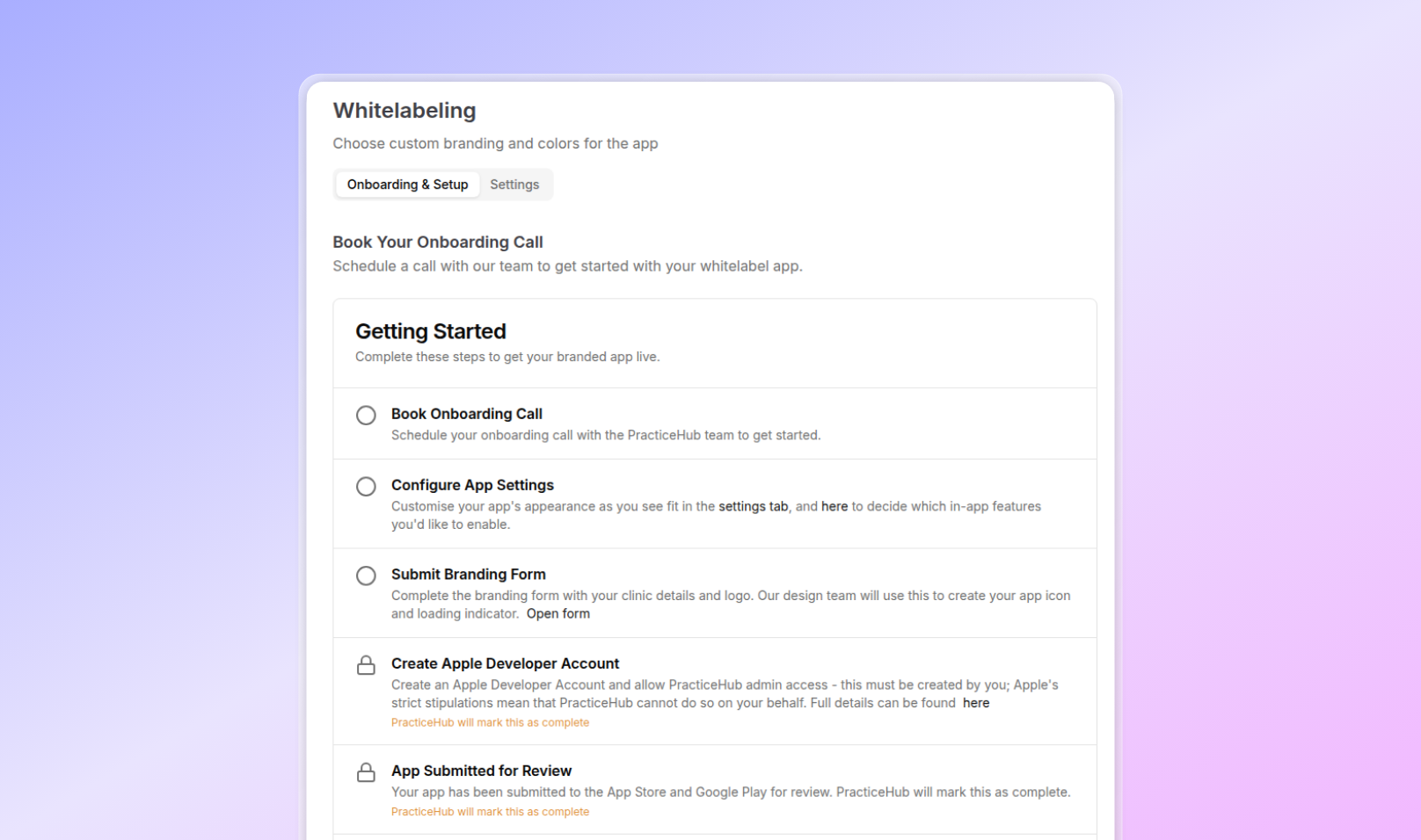 Need help getting started? Our Customer Success team is ready to assist via the chat beacon or email at help@practicehub.io.