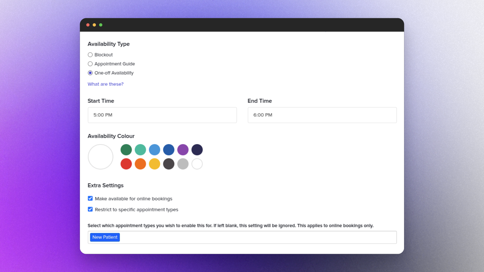 1. 'Make available for online bookings': Simply turn this on, and your one-off availability will act like a regular, non guide slot for online bookings (any appointment types that are bookable 'in appointment guides only' will not be able to book in this slot, as expected).